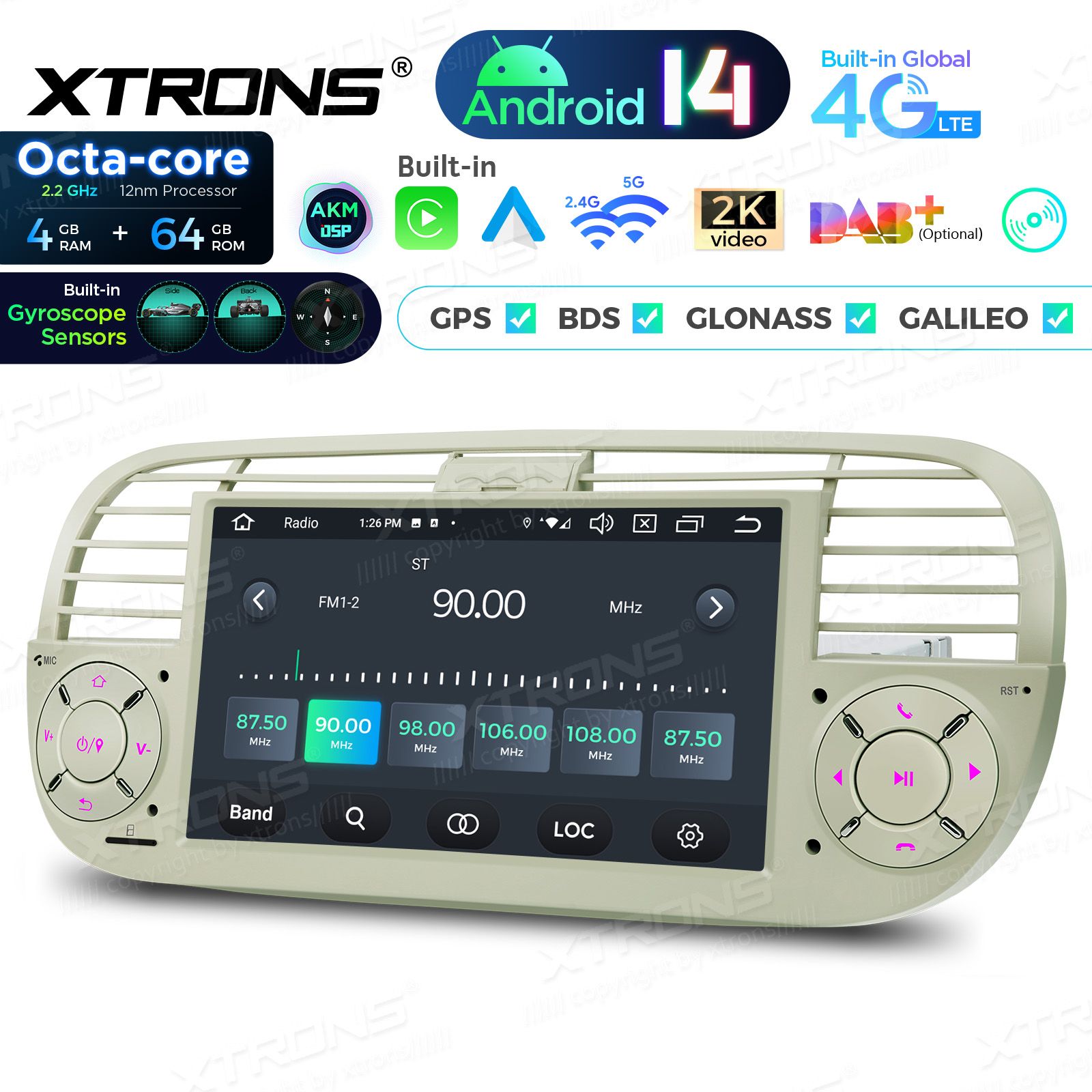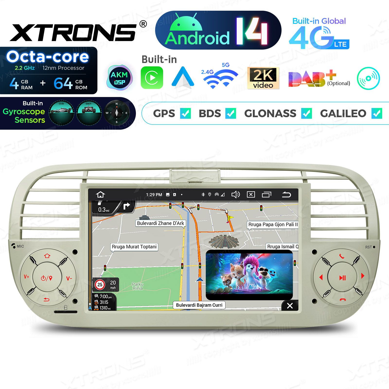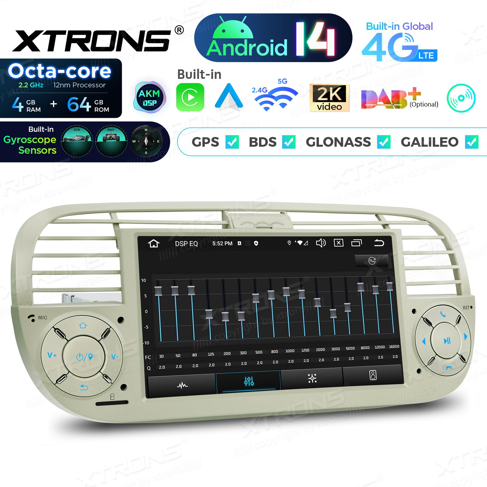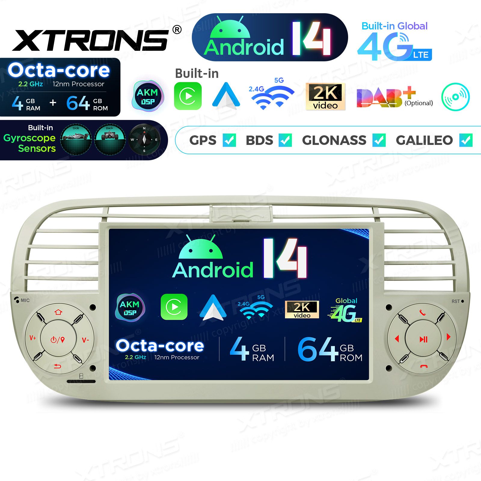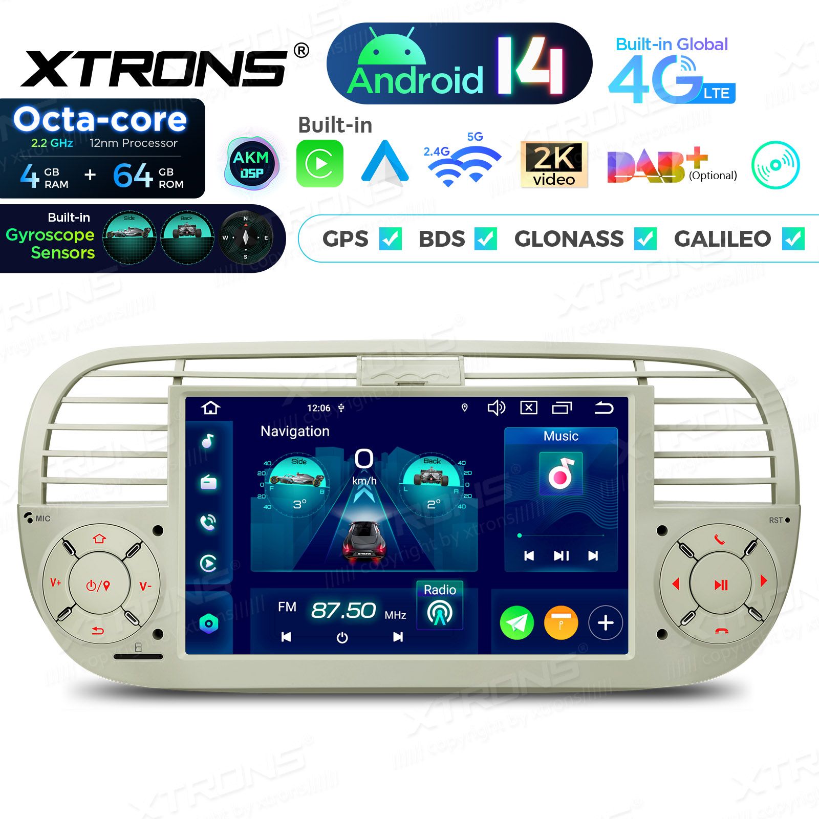 7" 4+64GB Global 4G LTE Android 14 IPS Car Stereo Multimedia Player Built-in AKM DSP Gyroscope Sensors Custom Fit for Fiat